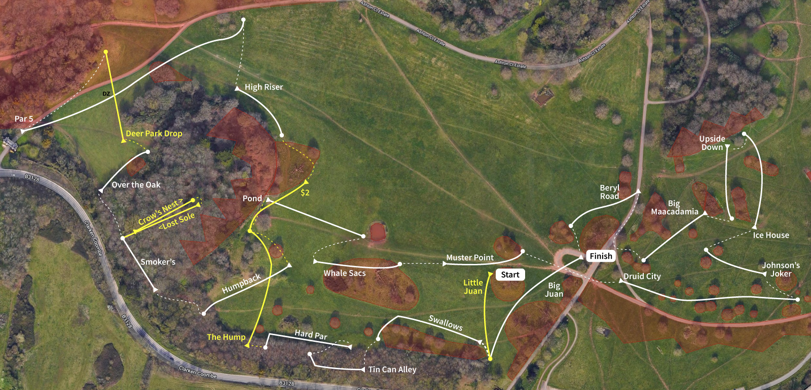 These maps are meant to accompany UDisc, which does a great job of locating you and showing you the next tee, but doesn’t allow us to indicate OB areas or add additional notes.