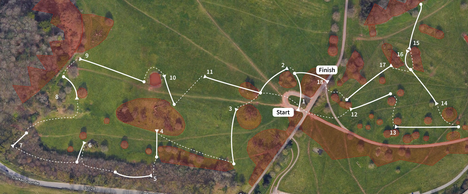 The red course uses the shorter ‘Blue’ holes, and some additional short holes to make a course that’s friendly for people using a normal frisbee (or an Ultrastar), but also great fun for experienced players to hone their approach game.