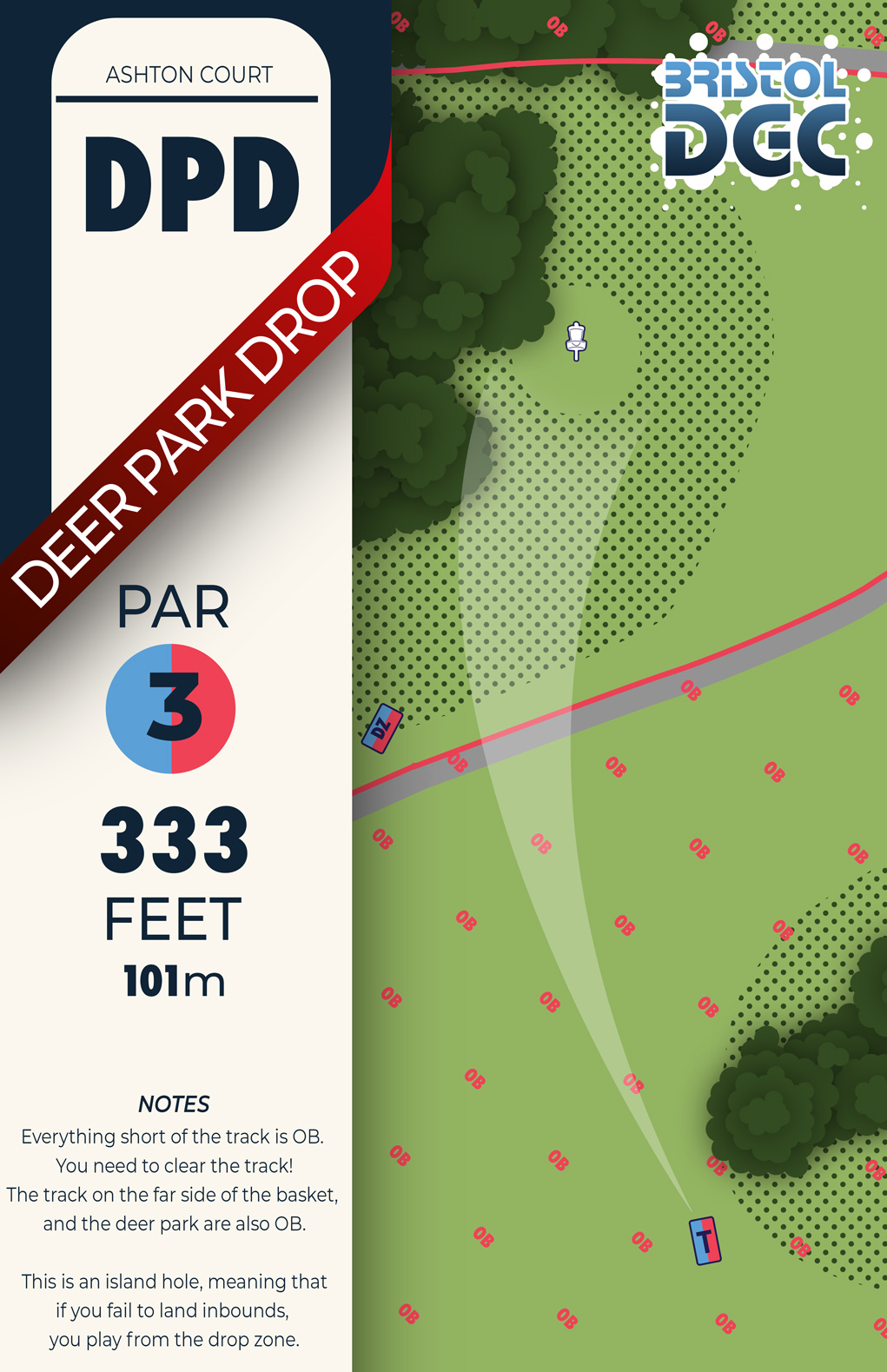 If you go OB from the tee, proceed to the drop zone (+1 penalty)