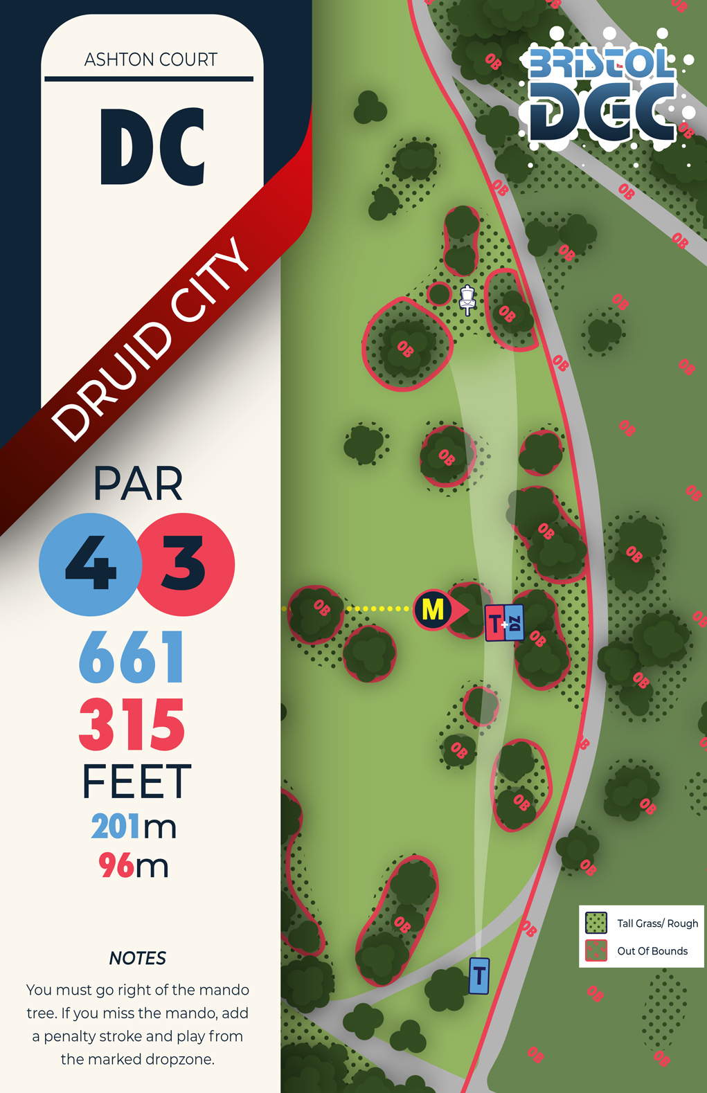 You must go right of the Mando tree (marked ‘X’). If you miss the mando, add a penalty stroke and play from the drop zone in the middle of the fairway (level with the mando tree).