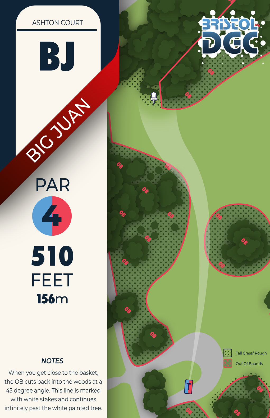 [OB Clarification]: When you get close to the basket, the OB cuts back into the woods at about 45deg.