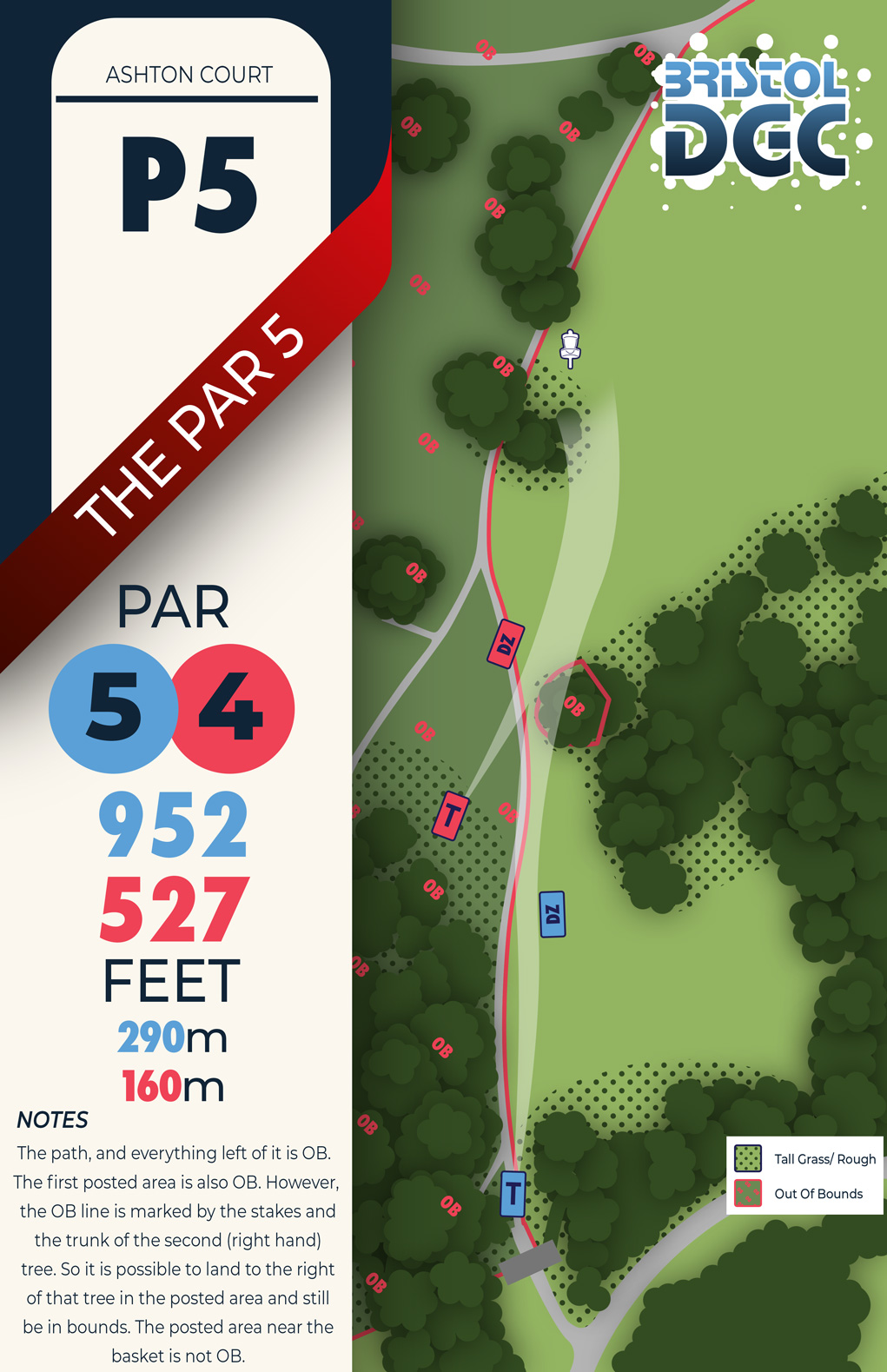 On this hole, if you go OB from the tee, you must proceed to the drop zone (+ 1 penalty) – you cannot play from where the disc left the fairway. DZ marked in blue on the map.